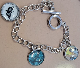 At our table, some of our merch includes: bookmarks, pins, magnets, charm bracelets, and choose your own charm keychains.